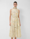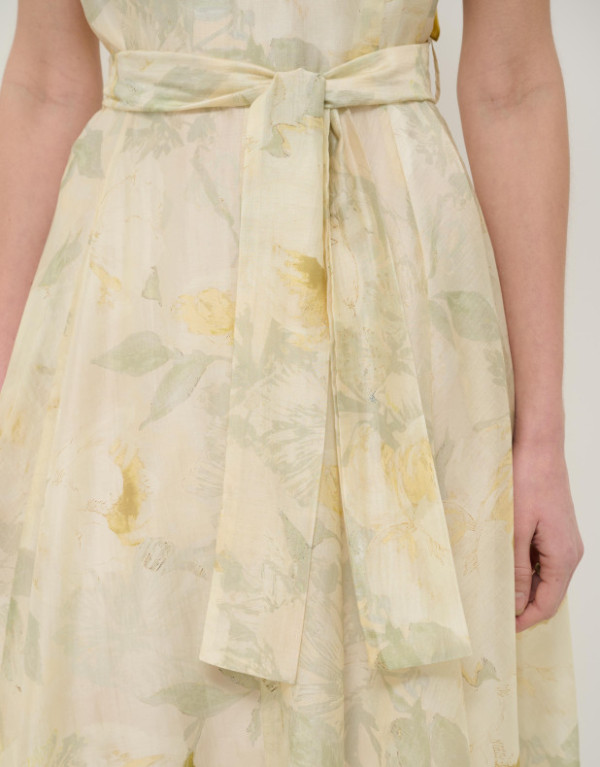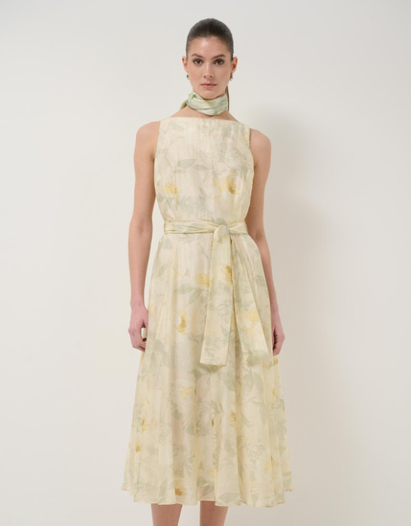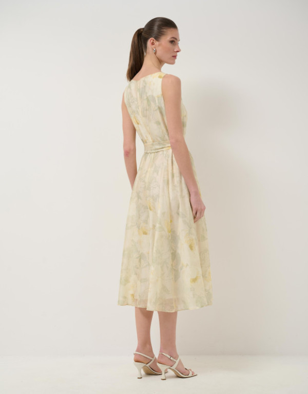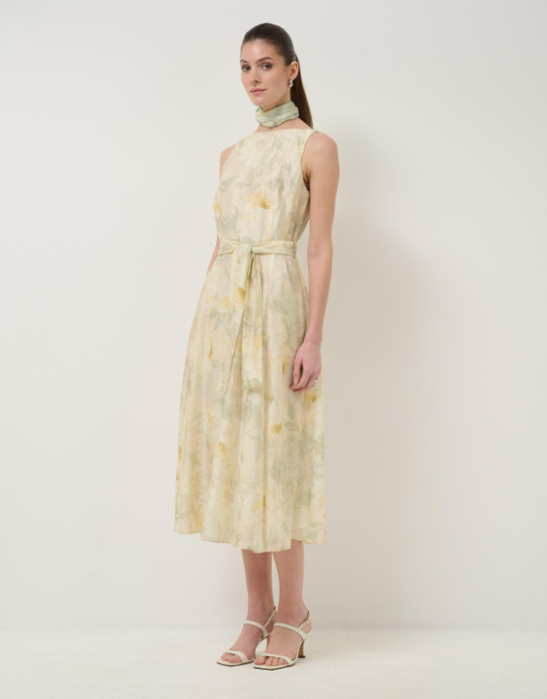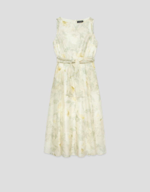 Vestido sin mangas en una gasa con diseño floral en tonos verdes y crudos con forro en el interior. Escote barco, bolsillos en falda, bajo con vuelo y cierre con cremallera oculta en costado y cinturón de atar en el mismo tejido.