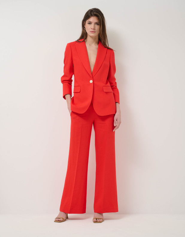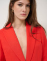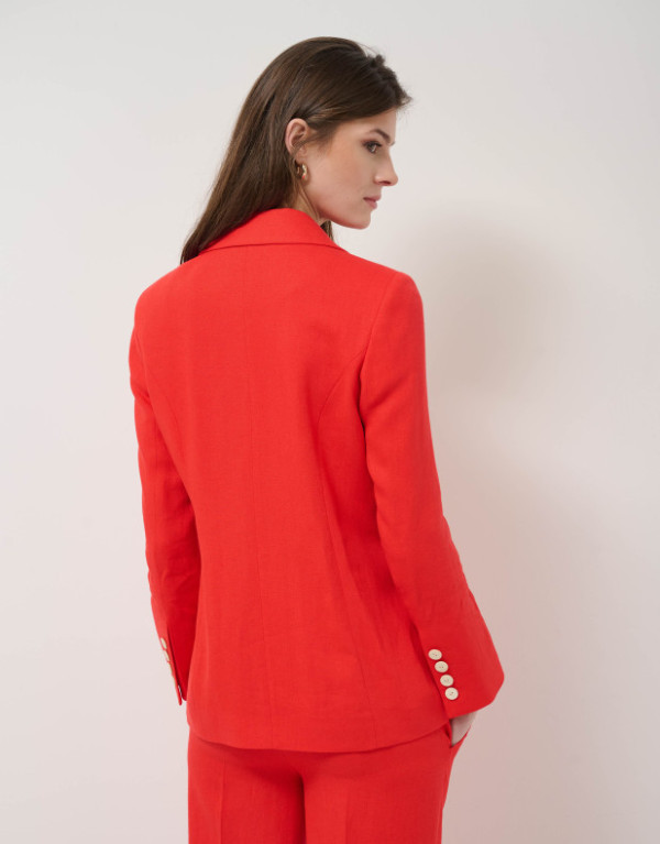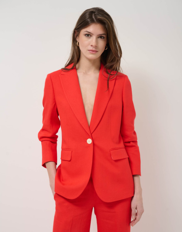 Blazer en un tejido mezcla con lino color rojo. Cierre de un botón y forro en el interior. Cuello solapa, manga larga rematada con botones y bolsillos con tapeta en delantero.