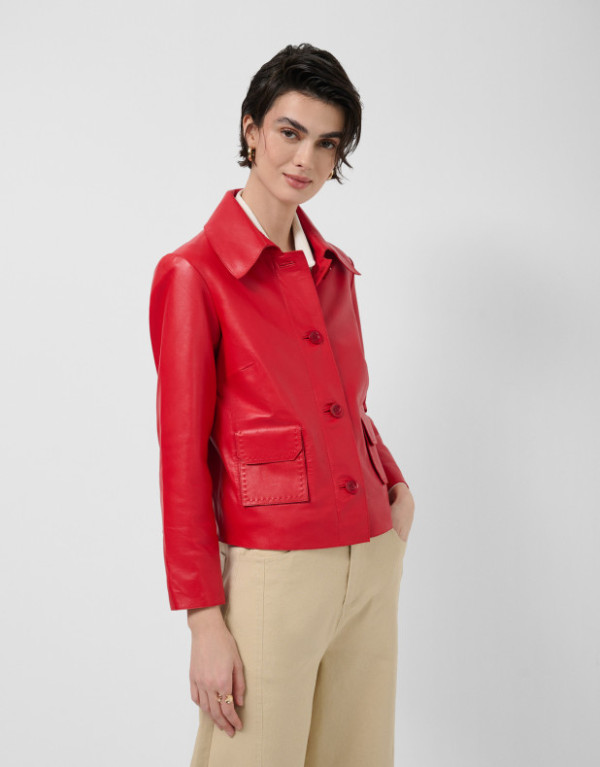 Chaqueta en napa color rojo con pespuntes a tono. Cuello camisero, dos bolsillos de tapeta y cierre con botones en delantero.