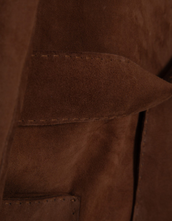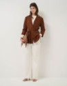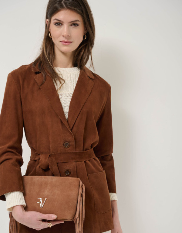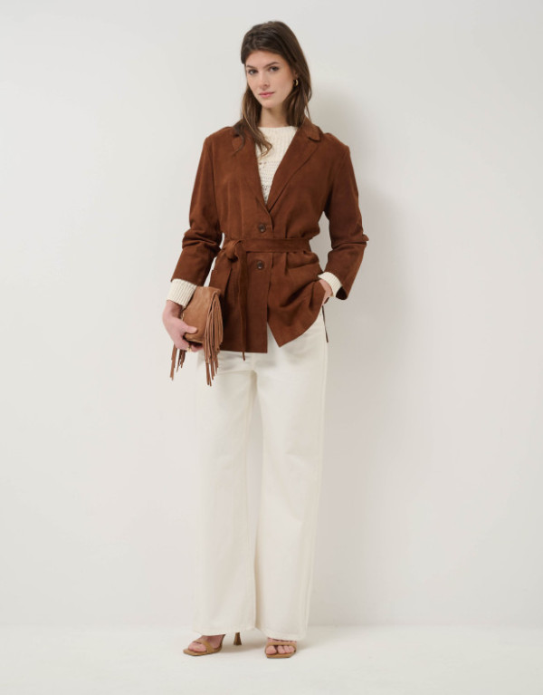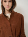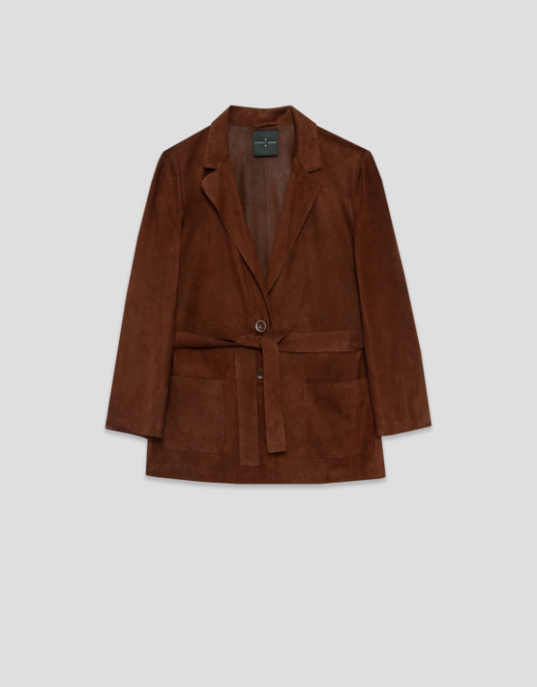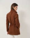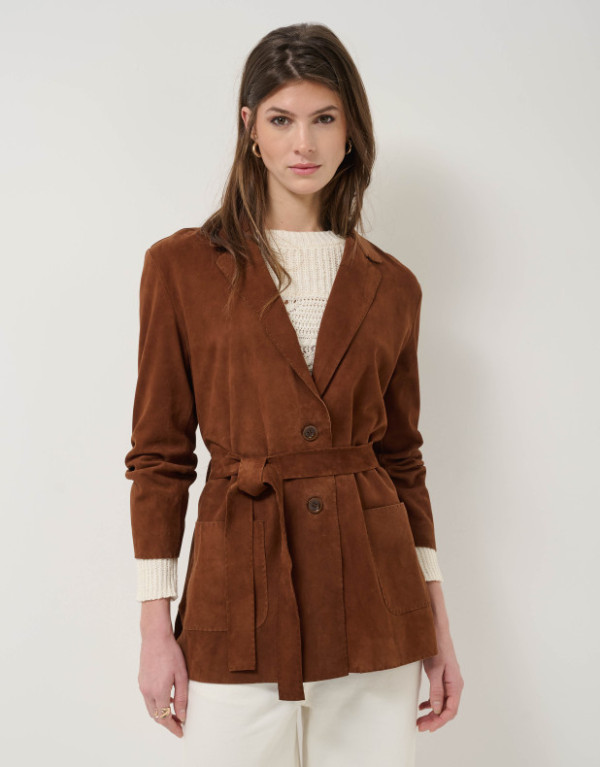 Chaqueta con cinturón en ante de cordero marrón. Cuello solapa, manga larga, dos bolsillos de plastrón y cierre con botones.