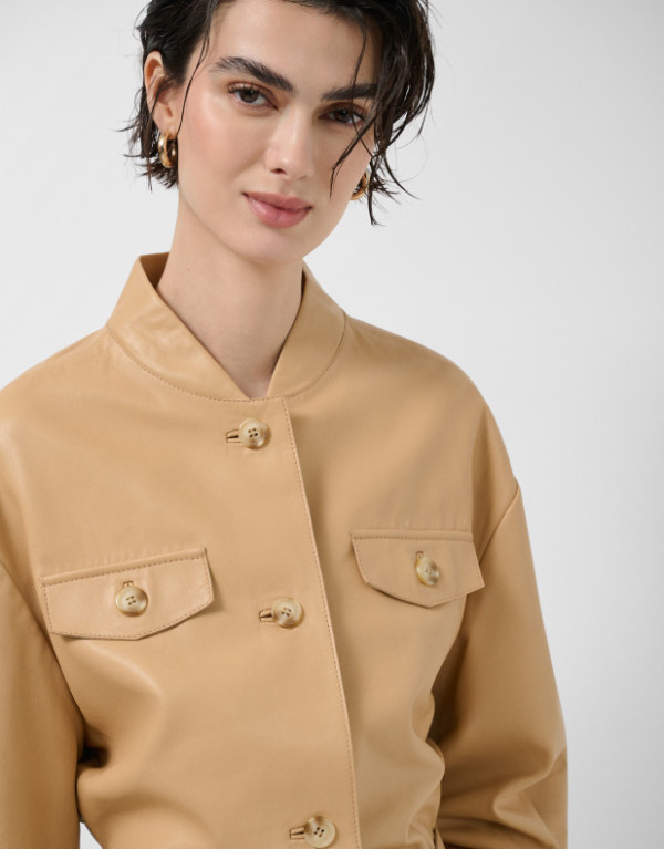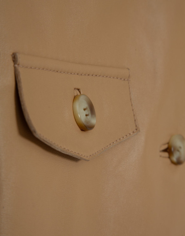 Cazadora corta en napa color cámel con cinturón de hebilla en cintura. Cuello mao, manga larga con pliegue y trabilla en bajo, dos tapetas con botón decorativas en pecho y cierre con botones.