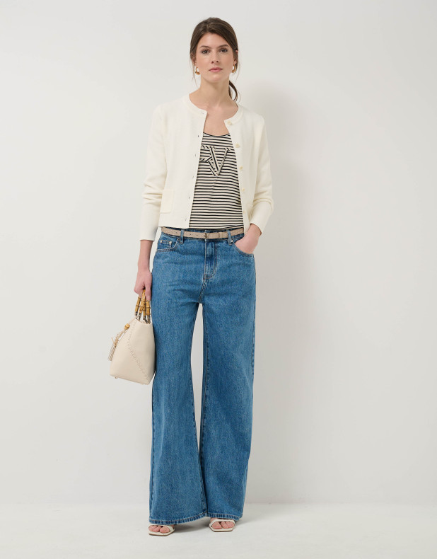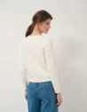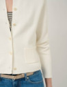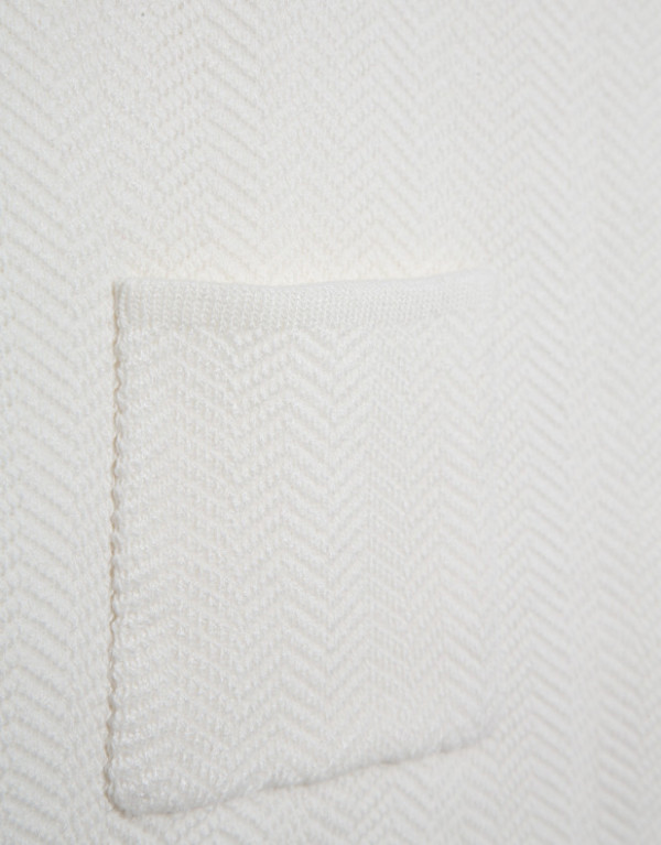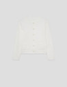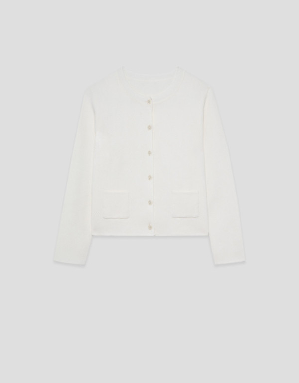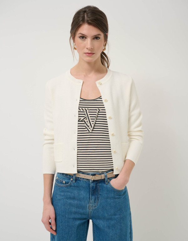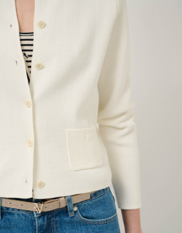 Chaqueta corta en un jacquard de punto con espiga en color blanco. Escote redondo, cierre con botonadura en delantero, dos pequeños bolsillos, uno personalizado, y remate de la prenda con perfil a tono.