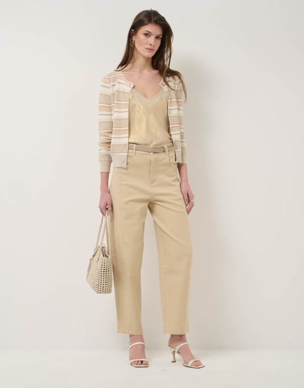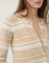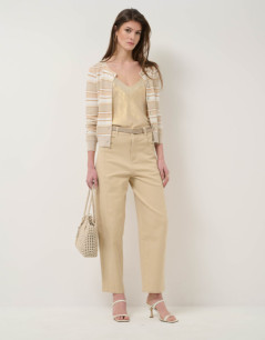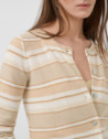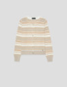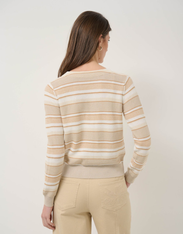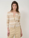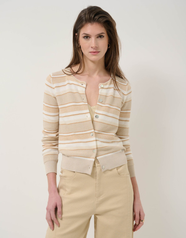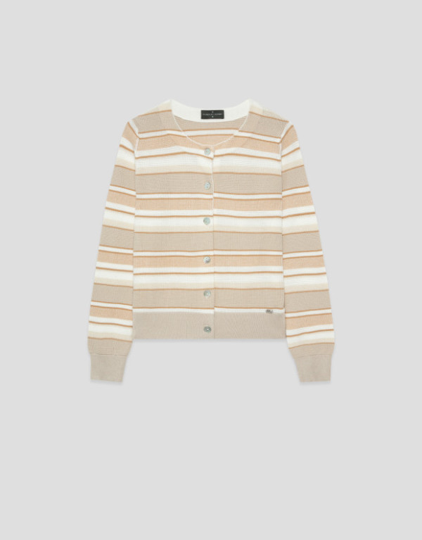 Cárdigan de manga larga en punto a rayas horizontales en tonos crudo y cámel. Escote redondo y cierre con botones.