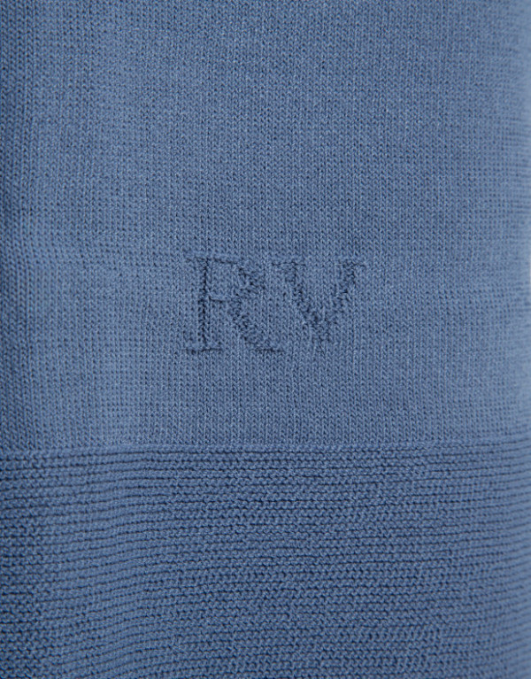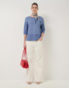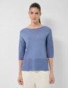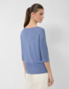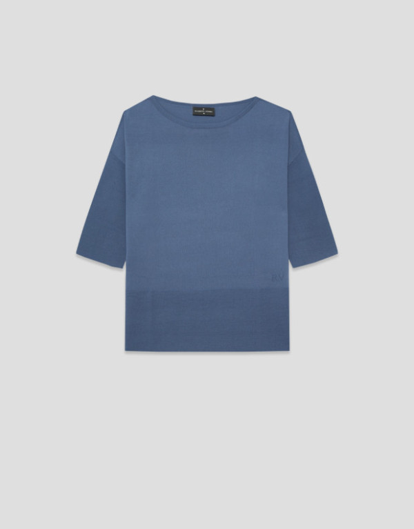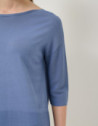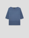 Jersey sin costuras de manga tres cuartos en un punto fresco de viscosa color azul. Escote barco, bajo con canalé horizontal y aberturas laterales.
