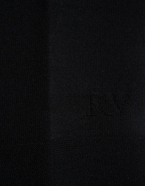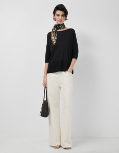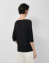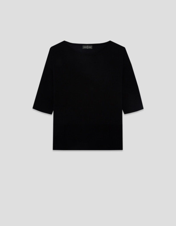 Jersey sin costuras de manga tres cuartos en un punto fresco de viscosa color negro. Escote barco, bajo con canalé horizontal y aberturas laterales.