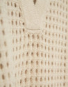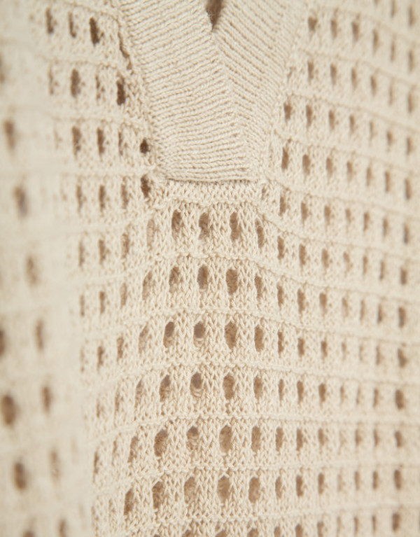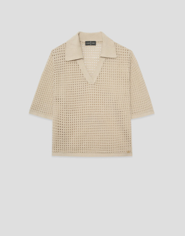 Jersey estilo polo en un punto con diseño calado en color cámel con cuello camisero y escote pico a contraste en punto liso. Manga tres cuartos y corte ancho.