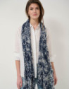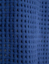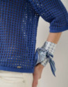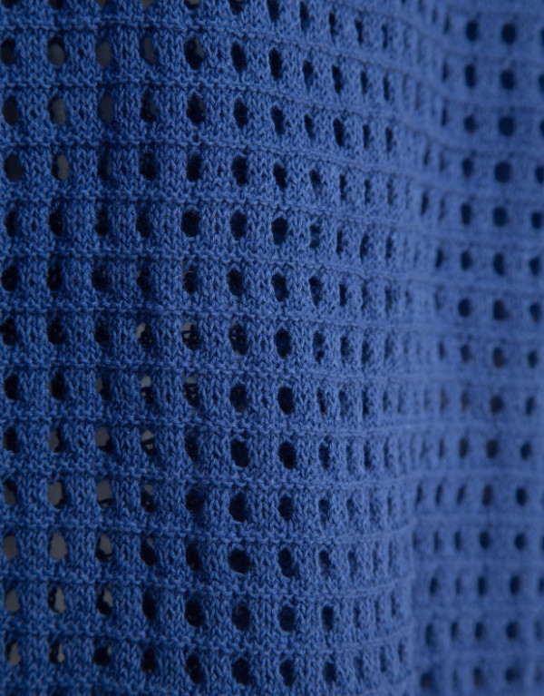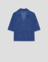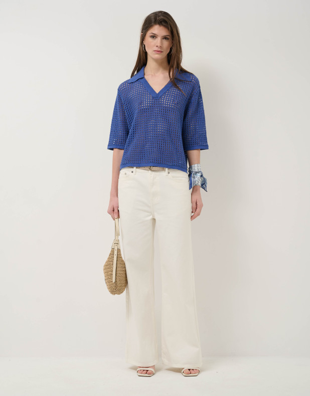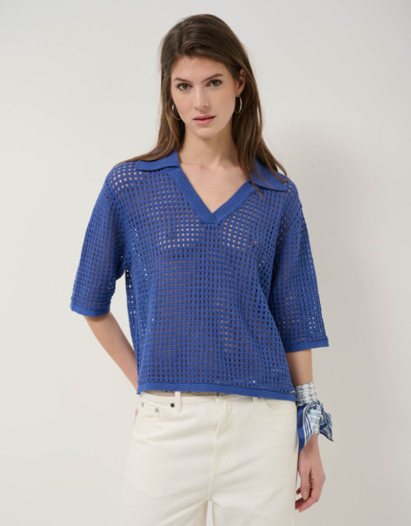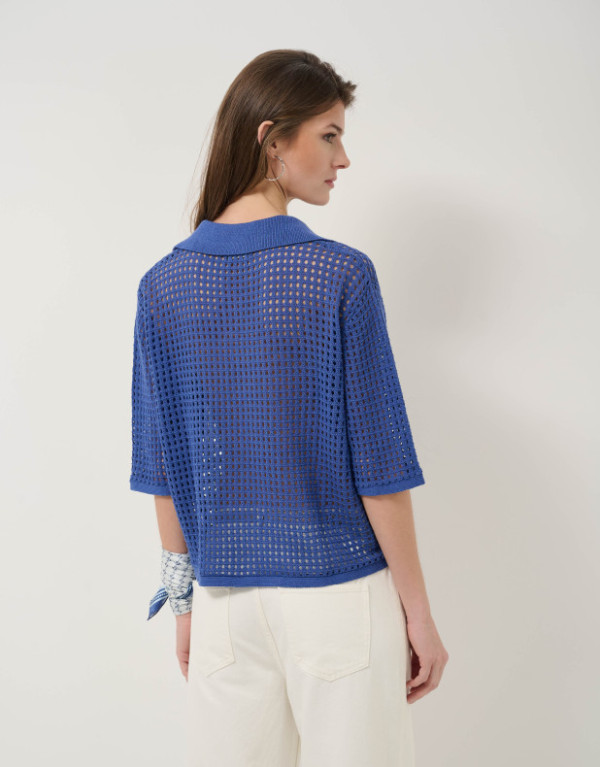Jersey estilo polo en un punto con diseño calado en color azul con cuello camisero y escote pico a contraste en punto liso. Manga tres cuartos y corte ancho.