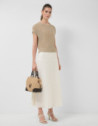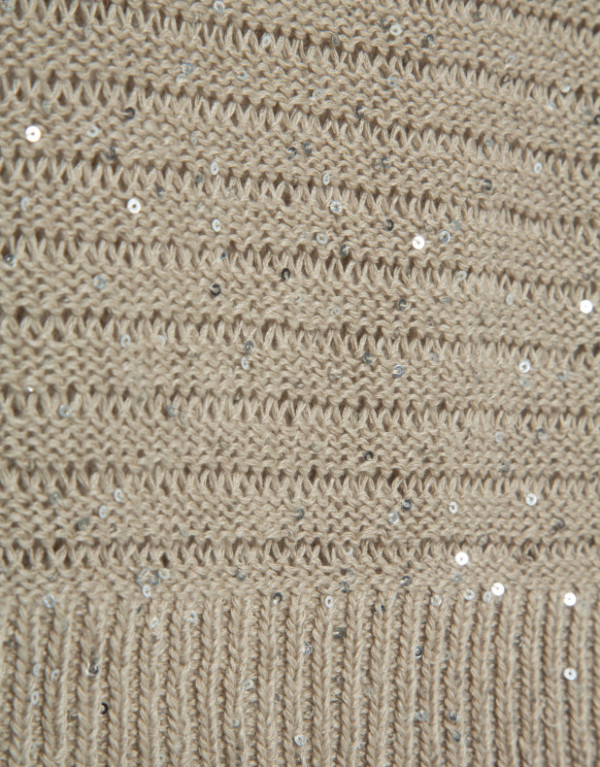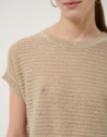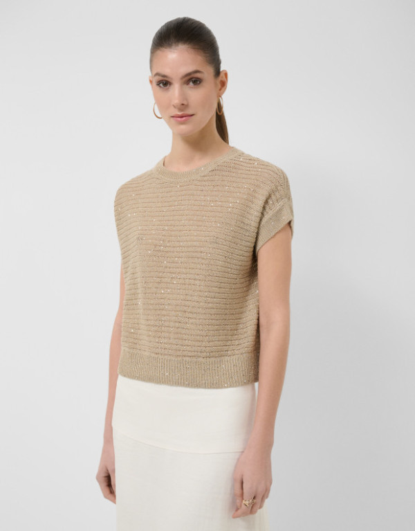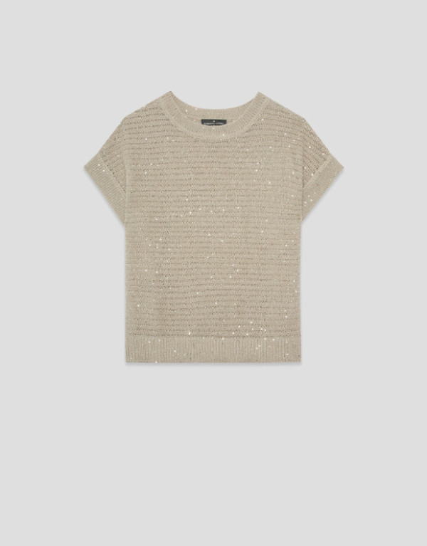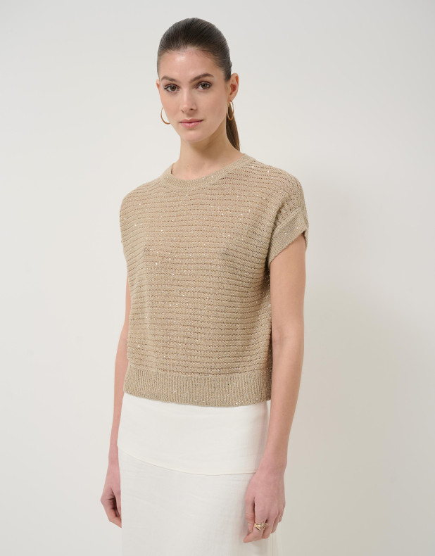 Jersey con escote barco en punto de lino trabajado con franjas horizontales con desagujados intercalados en color cámel con lentejuelas plata. Manga corta murciélago, cuerpo recto y canalé en bajos, manga y escote.
