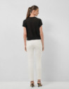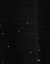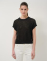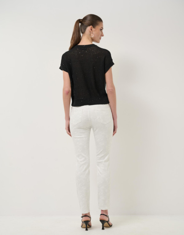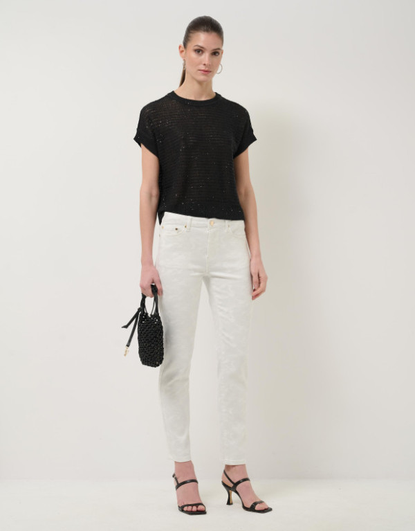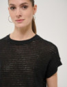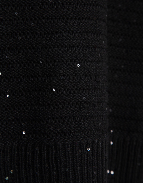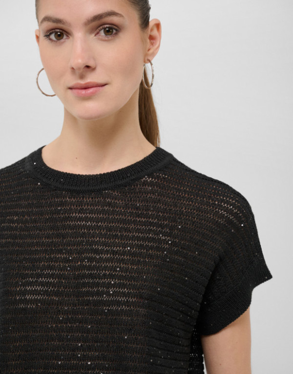 Jersey con escote barco en punto de lino trabajado con franjas horizontales con desagujados intercalados en color negro con lentejuelas plata. Manga corta murciélago, cuerpo recto y canalé en bajos, manga y escote.