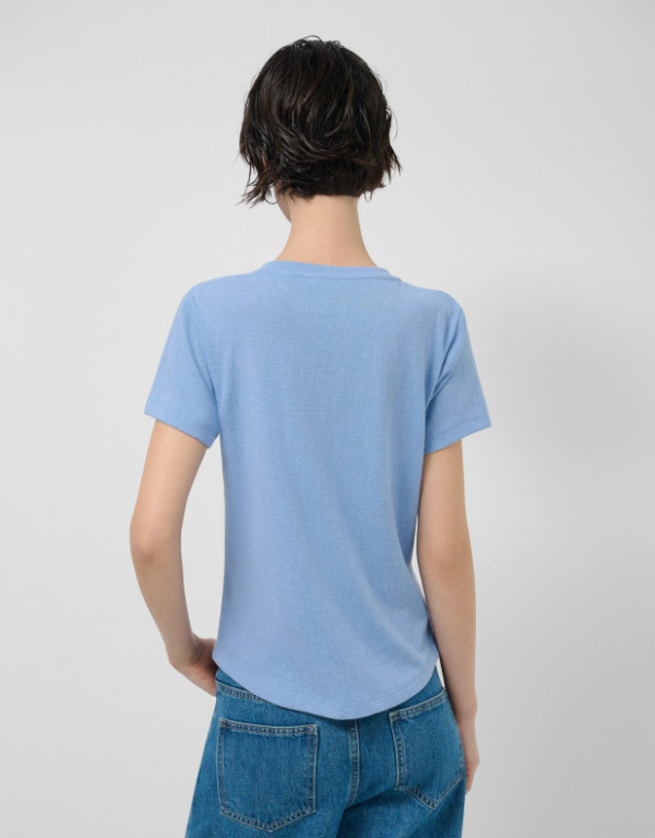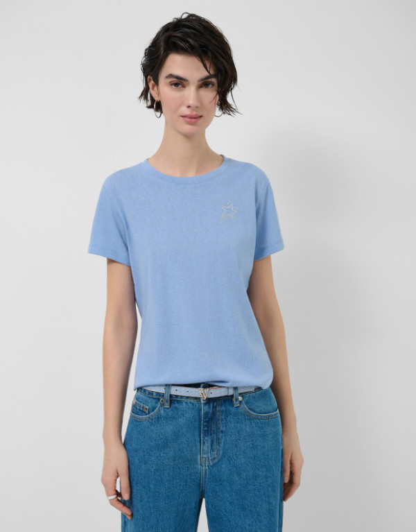 Camiseta de manga corta y cuello redondo en un punto de algodón ligero color azul melange. Corte recto y aplicación de estrellas con strass en pecho.