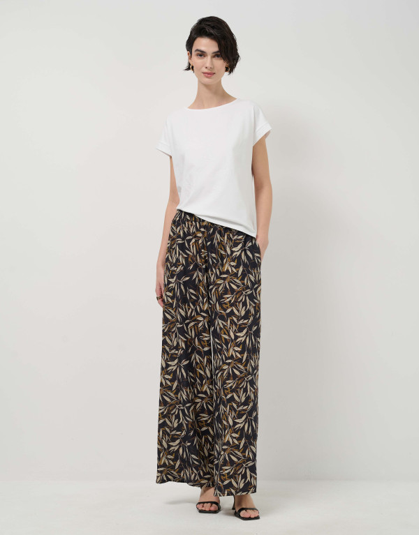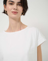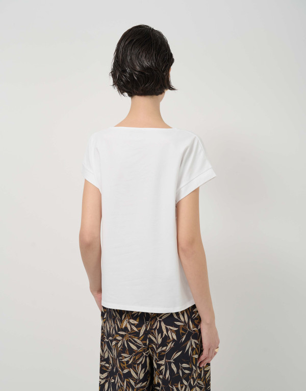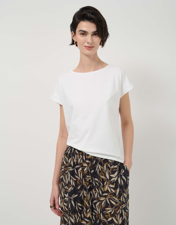 Camiseta de corte oversize en algodón blanco ligeramente elástico con bordado a tono de hojas en delantero. Escote barco y sin mangas.