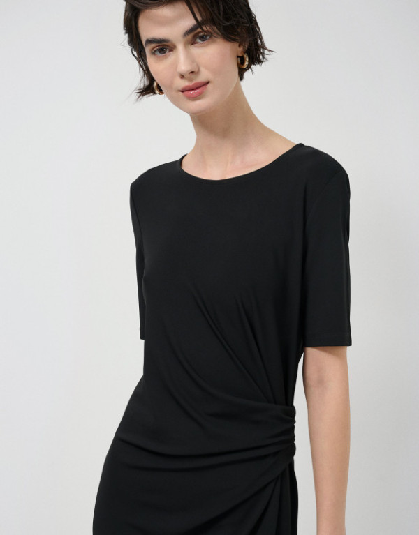 Vestido de manga corta en un punto ligeramente elástico color negro con fruncido lateral en cintura. Escote redondo y aberturas en bajo laterales.