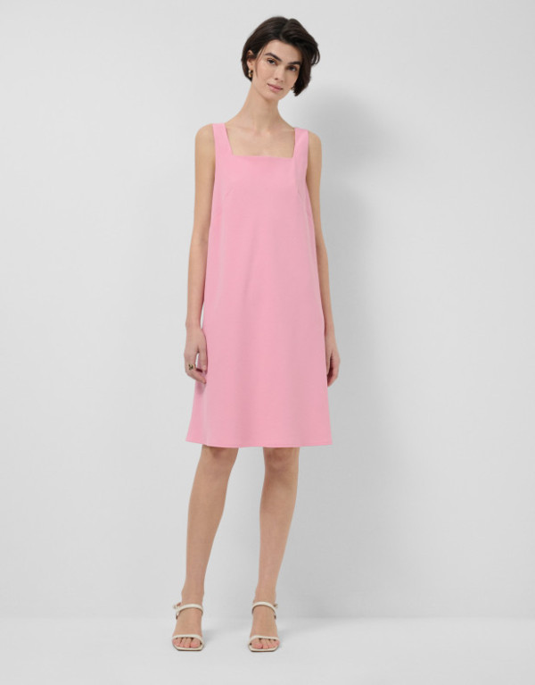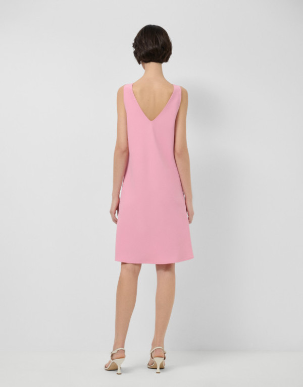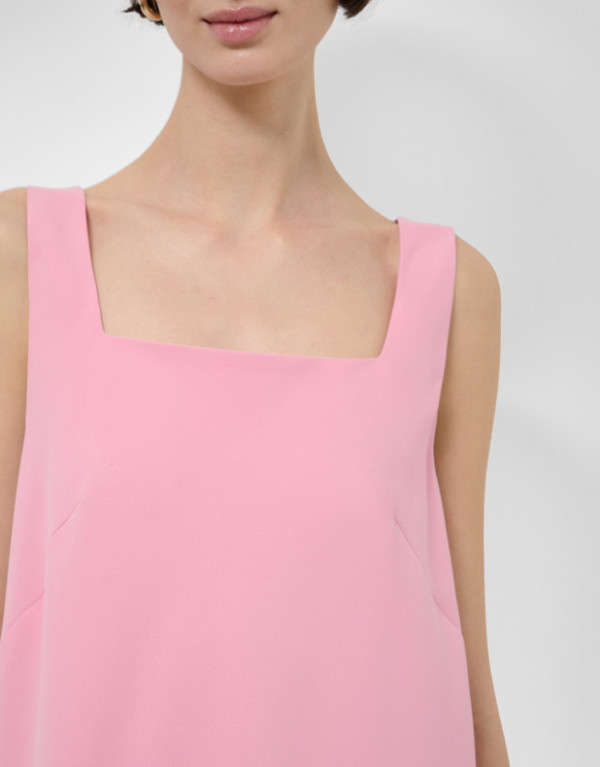 Vestido de sisas y corte evasé en un crepé rosa con escote cuadrado en delantero y pico en espalda.