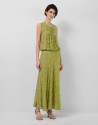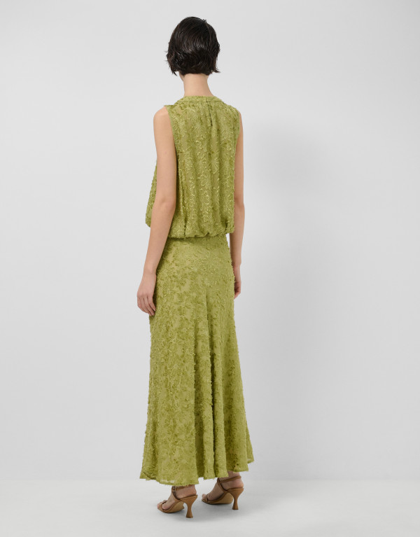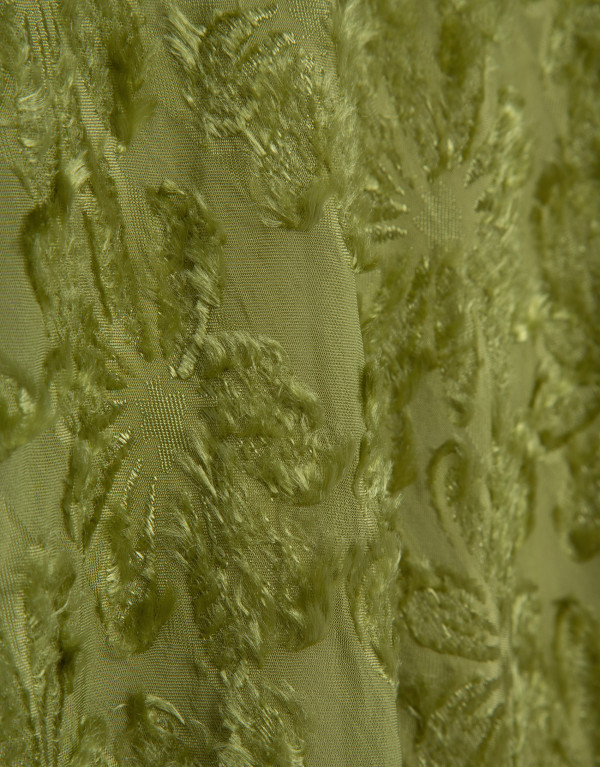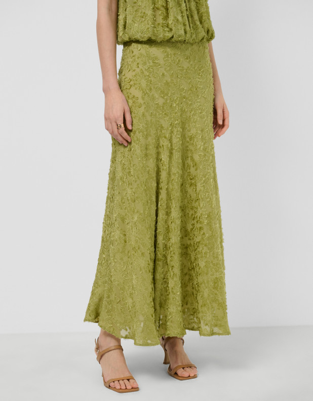 Falda midi en un tejido fill coupé con diseño floral color verde musgo. Cierre con cremallera oculta en lateral.