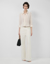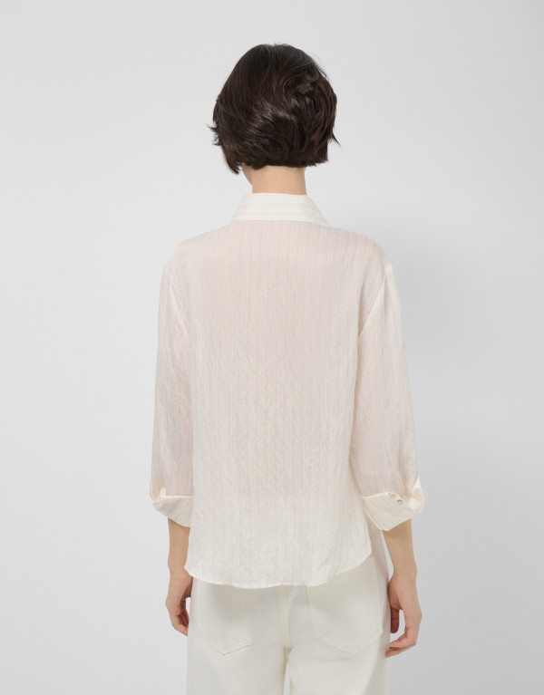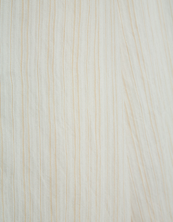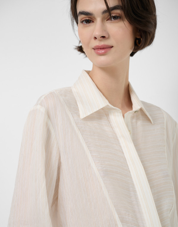 Blusa de manga larga con presilla para remangar en un tejido a rayas beige y crudo con líneas de jacquard en disposición vertical combinada con horizontal en pechera. Cuello camisero y cierre con botonadura oculta bajo tapeta delantera.