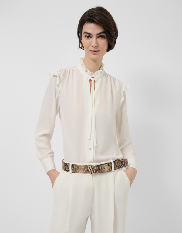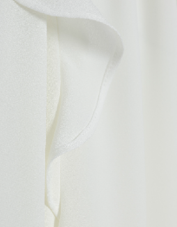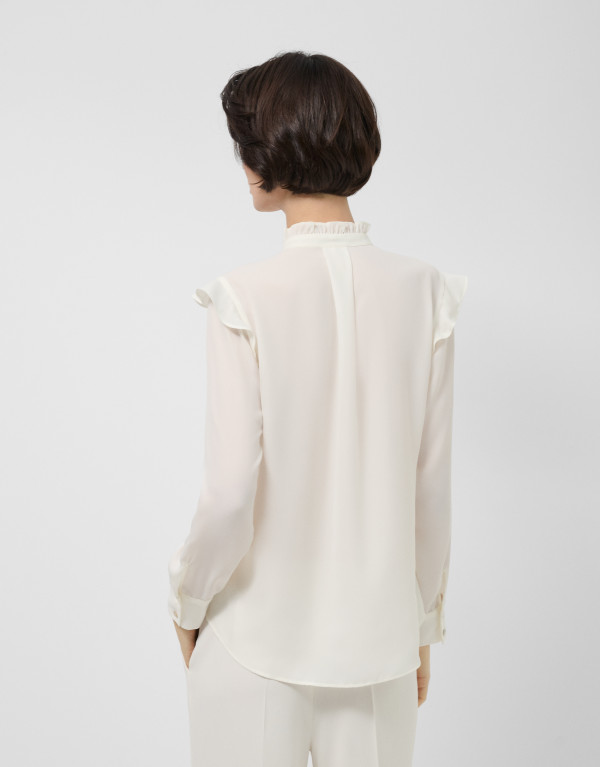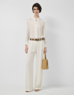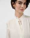 Blusa de manga larga en un crepé color crudo. Escote caja con volante insertado y lazada, hombros con fruncidos y manga larga abullonada rematada con puño y botón y volante en sisa. Cierre con botonadura vista en delantero.