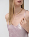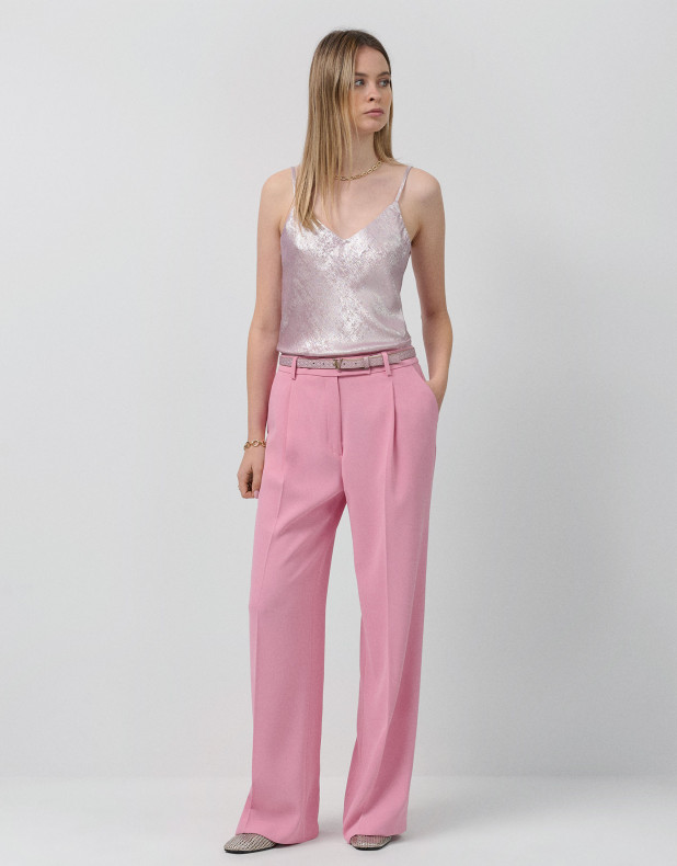 Top de sisas en un tejido laminado con brillo en color rosa. Escote pico en delantero y espalda y sisas ajustables.