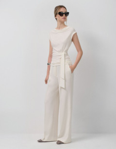 Camiseta sin mangas en un tejido fluido color crudo. Escote drapeado y cintura fruncida con lazo.