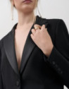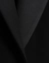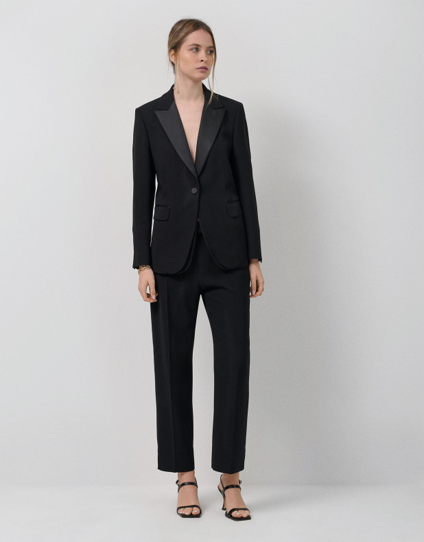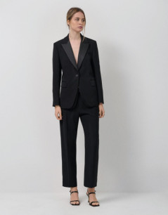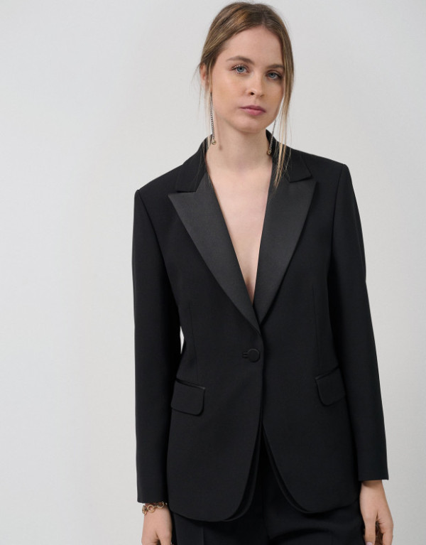 Blazer estilo smoking en crepé negro con tejido combinado satinado en solapa, ribete de bolsillos y bajo. Cierre de un botón, manga rematada con botones y bolsillos de tapeta en delantero.