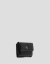 Cartera en piel craquelada color negro con monedero cerrado con broche bajo solapa e interior forrado y compartimentado para tarjetas, cerrado con broche. Personalizado con RV metálica. Metálicas en oro claro. Medidas aproximadas: 19 x 9 x 1 cm.