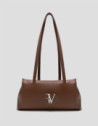 Bolso de hombro en piel color marrón claro con pespuntes a tono y logo RV metálico en panel delantero. Cierre con cremallera larga para facilitar apertura y con tira de piel con clips. Interior sin forrar y con bolsillos abiertos planos de piel de 25 x 16 cm. Asa de hombro de 33 cm de altura. Metálicas en oro claro. Medidas aproximadas bolso: 30 x 15 x 13 cm.