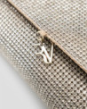 Bolso bandolera confeccionado en malla metálica de cristales incrustados en color dorado con RV metálica colgante en solapa. Cierre con clip, interior forrado y compartimentado con bolsillo plano. Asa bandolera de cadena metálica con doble posición: asa de hombro y asa bandolera. Metálicas en oro claro. Medidas aproximadas bolso: 19 x 11 x 5,5 cm.