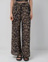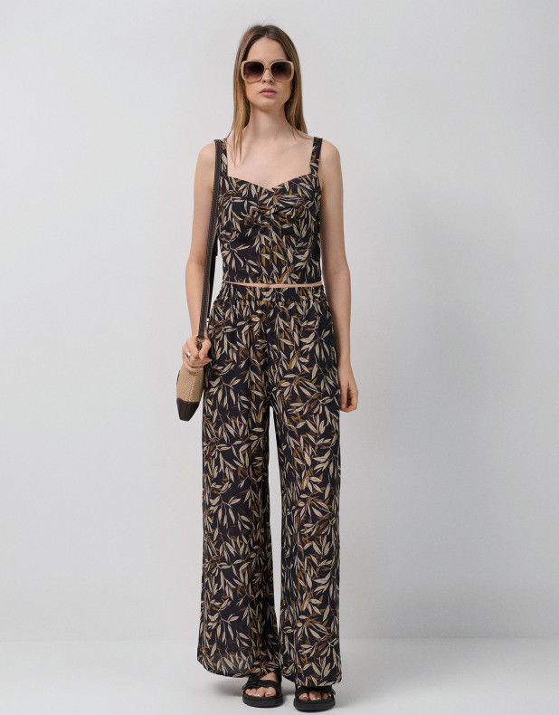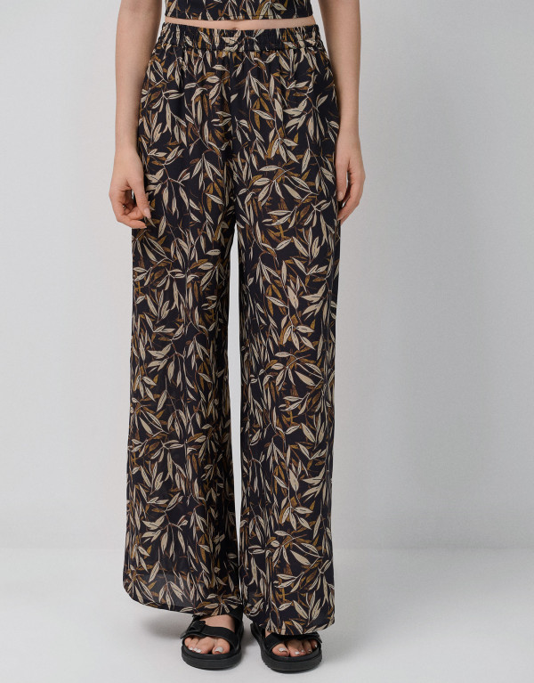 Pantalón palazzo crepé estampado hojas tonos marrones