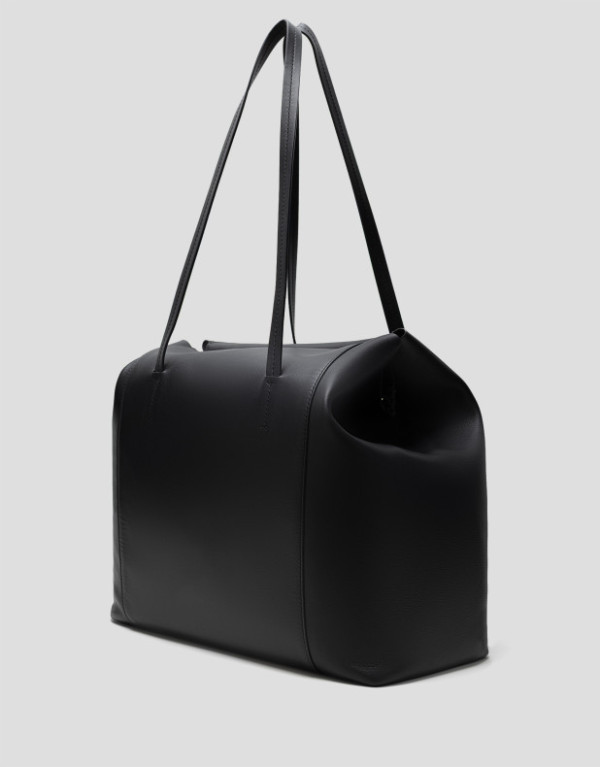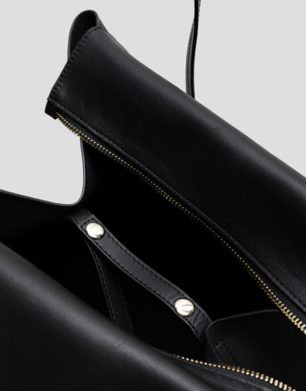 Bolso de hombro estilo shopper en piel color negro con cierre de cremallera y logo RV metálico en panel delantero. Interior forrado y compartimentado con bolsillo plano de piel y cremallera. Metálicas en oro claro. Altura asa: 44 cm. Medidas aproximadas: 35 x 35 x 13 cm.