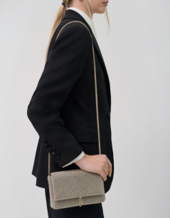 Bolso bandolera confeccionado en malla metálica de cristales incrustados en color dorado con RV metálica colgante en solapa. Cierre con clip, interior forrado y compartimentado con bolsillo plano. Asa bandolera de cadena metálica con doble posición: asa de hombro y asa bandolera. Metálicas en oro claro. Medidas aproximadas bolso: 19 x 11 x 5,5 cm.