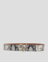 Cinturón en piel con grabado serpiente en tonos blancos, negros y grises, con forro personalizado y hebilla logotipo en oro claro. Ancho: 4 cm