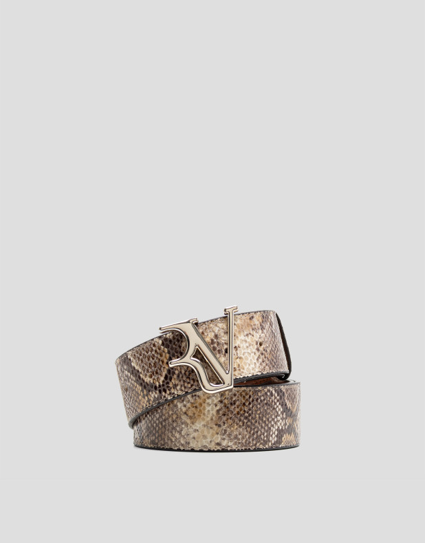 Cinturón en piel con grabado serpiente en tonos beige y cámel, con forro personalizado y hebilla logotipo en oro claro. Ancho: 4 cm